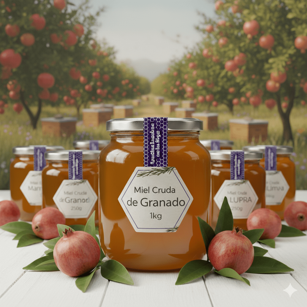 Esta miel es extraída de colmenares ubicados cerca de plantaciones de granados, asegurando su pureza varietal. Es **miel cruda**, garantizando su máxima calidad y conservación de nutrientes.